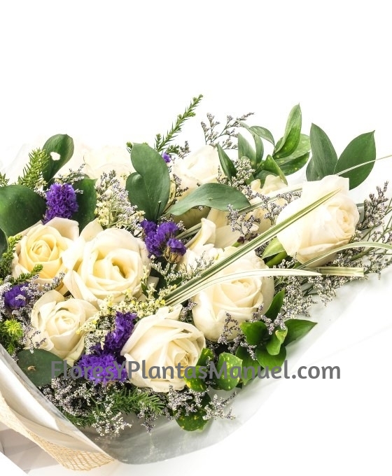 Bonito y fino Ramo Funerario 8 Rosas Blancas para entregar en los Tanatorios. Es un ramo funerario de flores variadas, en tonos blancos, confeccionado con rosas, limoniun azul y verdes variados que le dan al ramo de defunción un toque dulce y delicado. Desde Flores Manuel, nuestros ramos de flores para tanatorio blancas se envían a todos los Tanatorios de nuestra localidad, como muestra de cariño, aprecio y acompañamiento para la familia de la persona fallecida. Este ramo de flores para funeral es un producto de gran calidad, con flores para difuntos frescas suministradas a diario por nuestros proveedores, tanto nacionales como internacionales. Por lo que lo elaboraremos lo más parecido posible o a gusto del cliente. Nuestros trabajos de flores para funeral, están siempre realizados con flores para difuntos y verdes variados, Son ramos para funeral efectuados de forma totalmente artesanal por nosotros. Somos floristas profesionales, por lo que su ramo quedará bonito y elegante. Además, ofrecemos un servicio de envíos urgentes de flores para tanatorio.