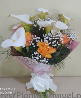 De entre nuestro ramos de flores de temporada, el Ramo Flores Calas y Rosas, realizado en tonos blancos y verdes, aporta un aire romántico y muy especial. Compuesto por, paniculata, 6 calas y 6 rosas. Es el ramo de regalo perfecto, que sin duda podemos hacer si lo que queremos es alegrar un día especial. Bonito ramo de flores de regalo que presenta nuestra floristería online, Flores Manuel en Torrelavega.