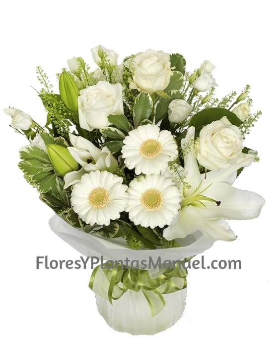Precioso este Ramo Flores París, confeccionado con preciosas flores como son las rosas, el lilium, el lisianthum y las gerberas, en tonos blancos y decorado con elegantes verdes que realzan todavía más la belleza de las flores blancas. Sin duda, un ramo de flores blancas de regalo, especial para una ocasión especial, como puede ser dar la bienvenida a un bebé, regalar a una novia, o bien simplemente por el deleite de las flores blancas, muy apreciadas por la dulzura e inocencia que inspiran. Es el regalo perfecto, que sin duda podemos hacer si lo que queremos es alegrar un bonito día. Bonito ramo de flores blancas de regalo que presenta nuestra Floristería Online de Flores Manuel. En la floristería online de Flores Manuel ofrecemos un servicio de envío de flores a domicilio con la compra de cualquiera de nuestros arreglos florales. Algo idóneo para las flores blancas para regalar.